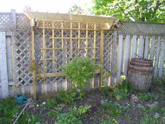 This matching piece to the arbour in the previous photo is made of pressure-treated, weather-resistant wood. Both were designed & built to match architectural features of the house. Imagine this piece in a couple of years once vines have had a chance to climb it!